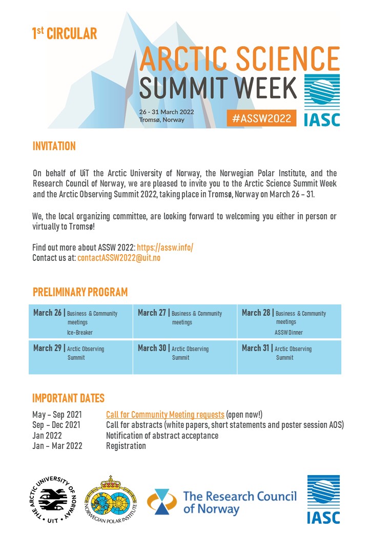 On behalf of UiT the Arctic University of Norway, the Norwegian Polar Institute, and the Research Council of Norway, we are pleased to invite you to the Arctic Science Summit Week 2022 and the Arctic Observing Summit 2022, taking place in Tromsø, Norway on 26 - 31 March 2022.